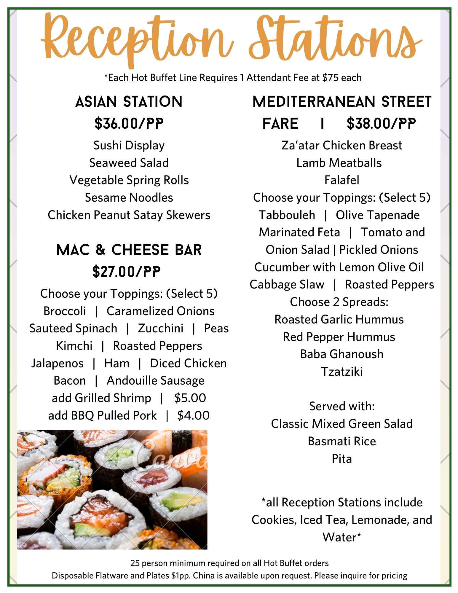 Just give us a FULL 3 days notice before the event and browse our menu for the foods you want. If you don’t see what you need on our menu, we’ll be happy to customize a menu to best suit you.
