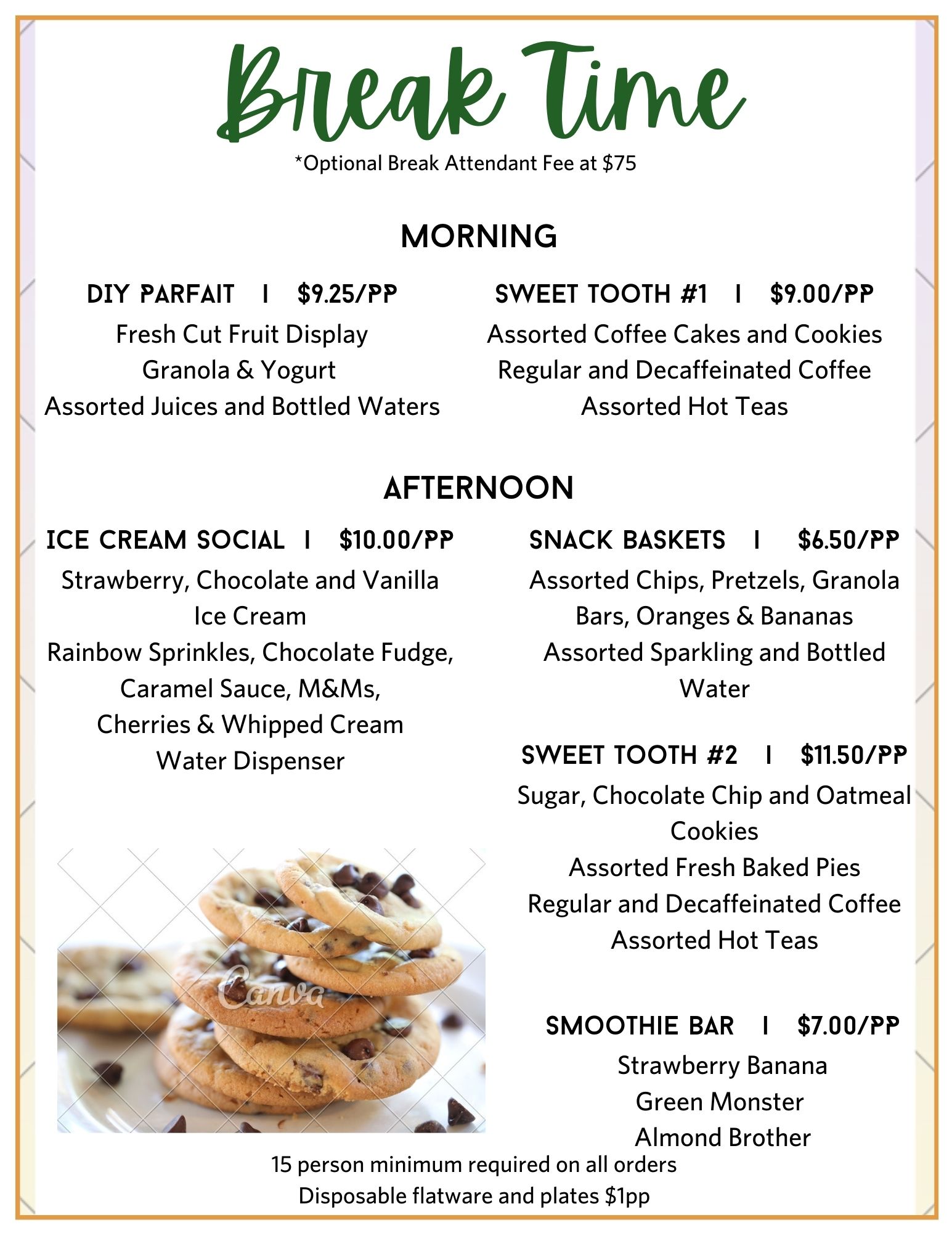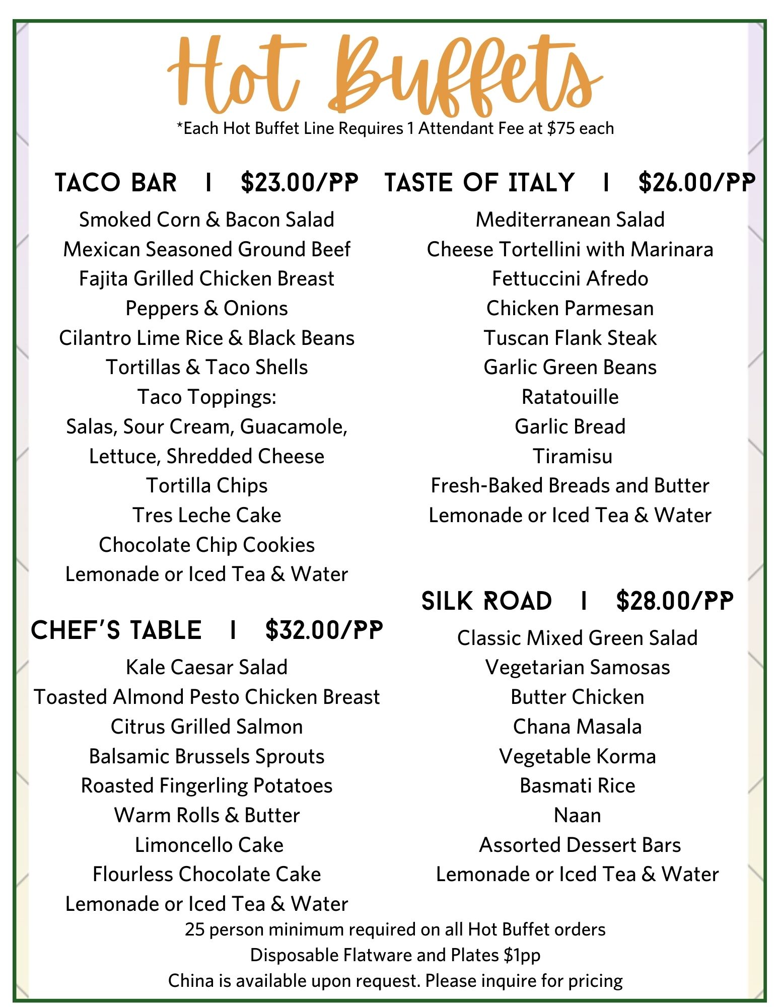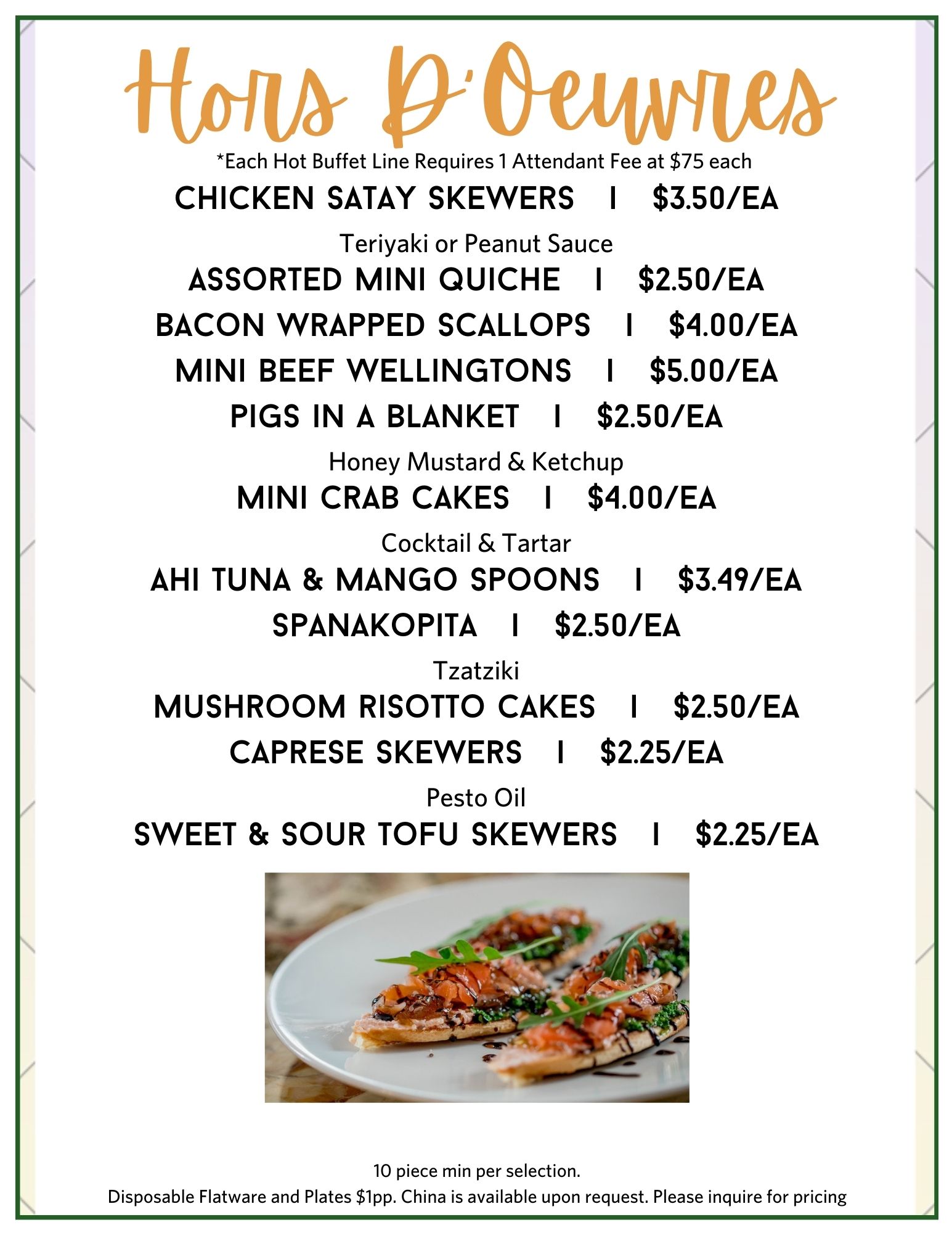 Just give us a FULL 3 days notice before the event and browse our menu for the foods you want. If you don’t see what you need on our menu, we’ll be happy to customize a menu to best suit you.