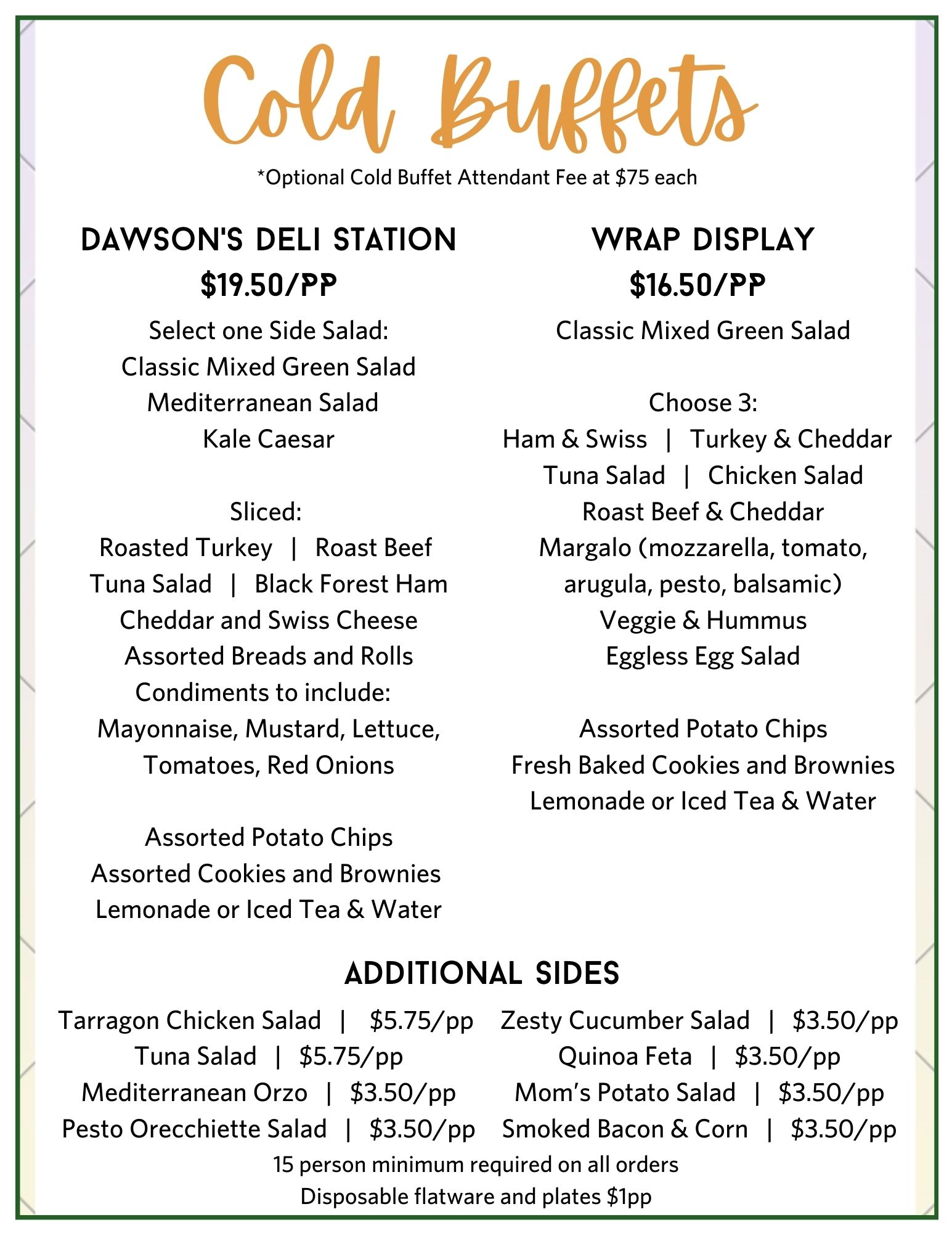Please place all orders ONLINE using the big green button on this page. If you have any questions please feel free to email catering@Dawsonsmarket.com or stop in person at our Cafeteria at USG.